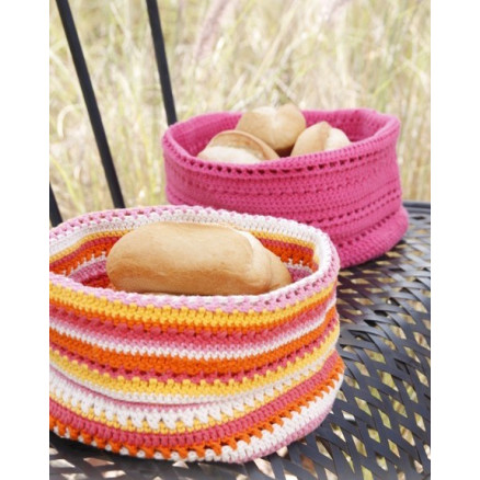 Al Fresco by DROPS Design er en flot, stribet brødkurv. Kurven er hæklet i Drops Paris, som er 100 % Bomuld.
