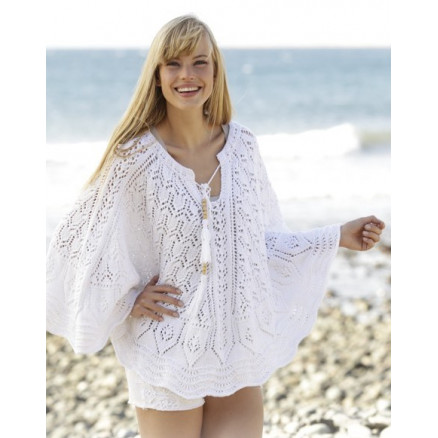 Angelica by DROPS Design er en lækker poncho, som er strikket ovenfra og ned. Ponchoen er strikket i Drops Belle med hulmønster og en slids foran.Â