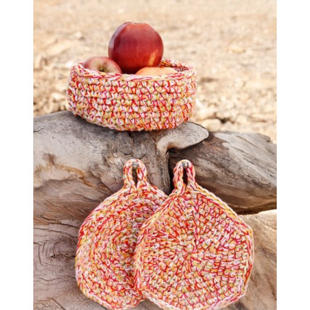 Bright Summer by DROPS Design er en fin, hæklet kurv og to grydelapper. Sættet er hæklet med 5 tråde Drops Safran, som er 100 % bomuld.Â