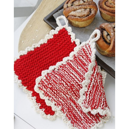 Hotspot by DROPS Design er fine julegrydelapper. Grydelapperne strikkes med 2 tråde af Drops Paris med en fin hæklekant.