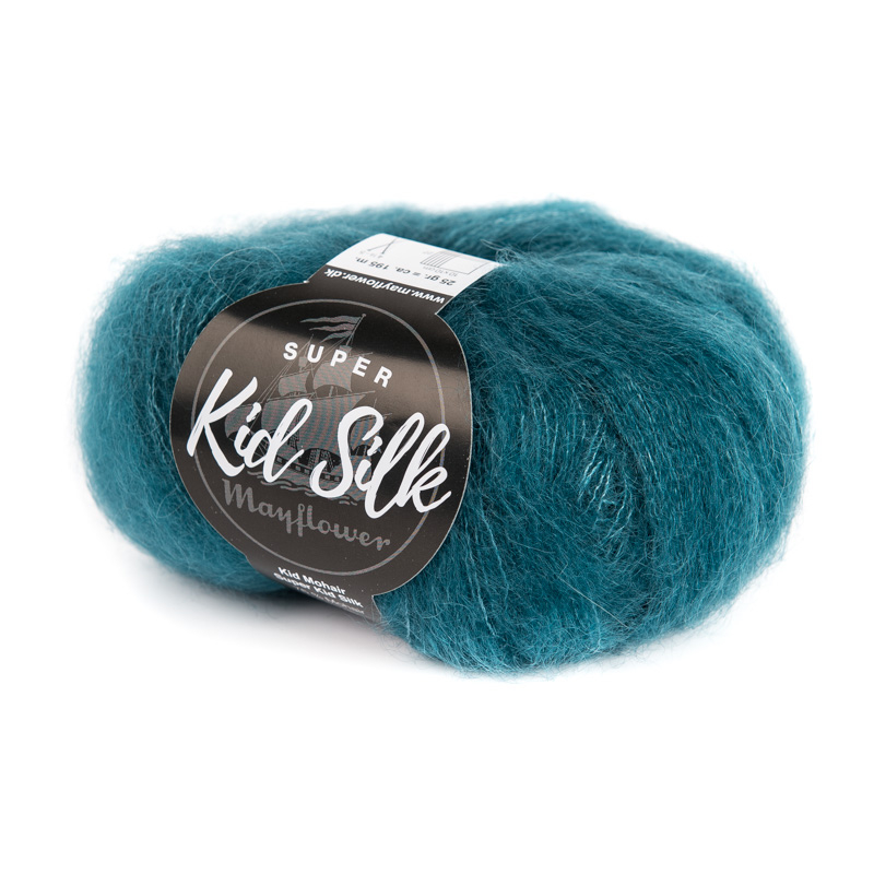 Mayflower Super Kid Silk – Petroleum 26, Garntype:Mohair/Silk, Indhold:76% mohair/24% silke, Garngruppe:B (22-20 ), Vægt:25 g, Længde:195 m, Anbefalede Pinde/Nåle:4,5-5 mm, Strikkefasthed:22 m, Håndtering:Håndvask ved max 20ºC, fra Mayflower. Køb hos Kuku