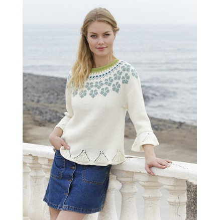 Myosotis by DROPS Design er en lækker trøje strikket i Drops Cotton Merino. Blusen har 3/4 ærmer med flæser, og strikkes ovenfra og ned i flerfarvet norsk mønster.