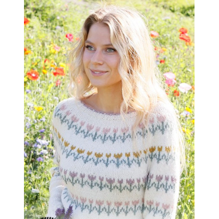 Spring Parade by DROPS Design er en smuk bluse med rundt bærestykke og blomster / folklore mønster, som strikkes i Drops Sky