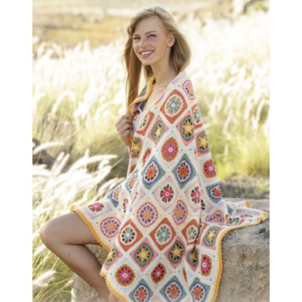 Starstruck by DROPS Design er et fint og farverigt tæppe, som er strikket i Drops Safran. Tæppet er strikket i farverige søstjerneruder, som syes sammen.