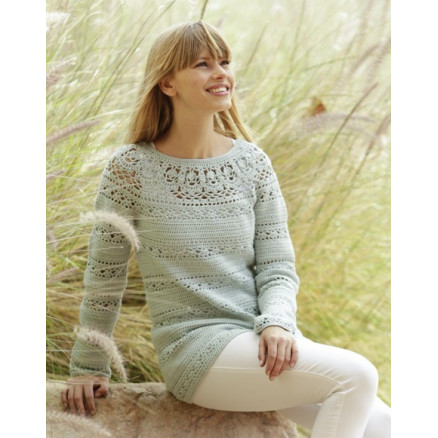 Sweet Mint by DROPS Design er en fin bluse, som er hæklet i Drops Safran. Blusen er hæklet ovenfra og ned med et rundt bærestykke og hulmønster.