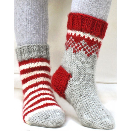 Twinkle Toes by DROPS Design 2 er et par julesokker med vinrøde og naturhvide striber. Sokkerne er strikket i Drops Karisma.
